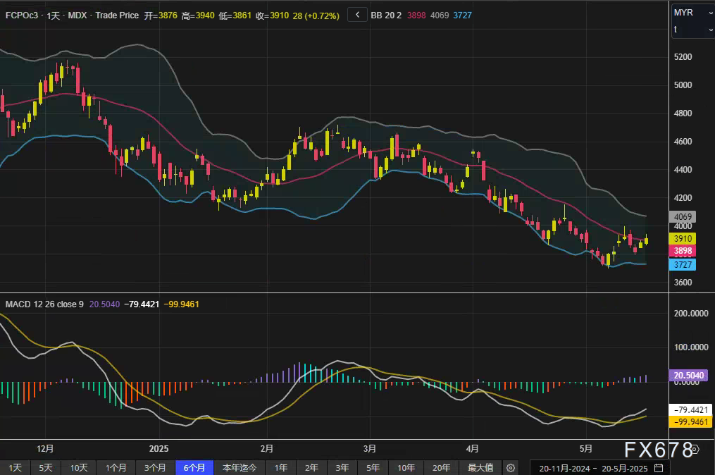 马来西亚棕榈油局(MPOB)最新数据显示,4月末棕榈油库存攀升至六个月高位,产量创十年来同期新高,而国内消费意外下滑,供需矛盾加剧。 这一库存压力在5月上旬有所延续,限制了价格上行空间。然而,货运调查机构估算,5月1日至20日马来西亚棕榈油出口量较上月同期增长1.6%至5.3%,显示需求端有所改善。 出口数据虽未形成强劲复苏信号,但为市场提供一定支撑。此外,马来西亚政府将6月毛棕榈油参考价下调至9.5%出口税区间,旨在提升出口竞争力,可能进一步刺激需求。   消息面:外部油脂市场与汇率波动影响   大连商品交易所棕榈油合约(DCPcv1)今日上涨1.25%,豆油合约(DBYcv1)微涨0.49%,受中国近期刺激措施提振市场情绪。Iceberg X Sdn Bhd交易员David Ng指出:“大连棕榈油价格上涨主要得益于中国政府一系列刺激措施,市场情绪因此改善。” 芝加哥期货交易所(CBOT)豆油合约(BOcv1)隔夜上涨后今日回落0.3%,显示竞争油脂价格波动对棕榈油影响显著。 棕榈油作为全球植物油市场重要组成部分,其价格走势常与豆油等竞争油脂联动。   林吉特兑美元汇率今日贬值0.19%,使棕榈油对海外买家更具价格吸引力,部分抵消了库存压力。 然而,原油价格因地缘政治不确定性而持稳,对棕榈油作为生物燃料原料的成本支撑有限。 市场需关注后续地缘局势对油价的潜在影响。   日K线技术面显示,布林带(20,2)上轨4069林吉特,中轨3898林吉特,下轨3727林吉特,价格站稳中轨,显示短线企稳迹象。MACD指标(12,26,9)快线20.5040,慢线-79.4421,柱状线-99.9461,负值区域柱状线收窄,暗示下跌动能减弱。,表明反弹动能未形成趋势性反转。