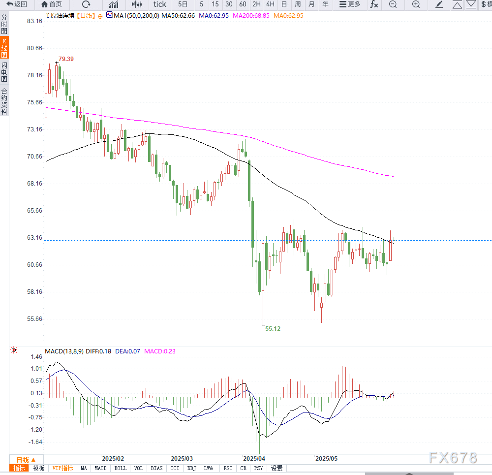 伊朗因素持续为油价提供支撑。一位伊朗外交官周一表示,伊朗将拒绝美国提出的结束核争议的协议草案,理由是该协议未能顾及德黑兰的利益,也未缓和华盛顿在铀浓缩问题上的立场。   如果伊核谈判破裂,将意味着对伊朗的制裁继续存在,从而限制该国原油供应。   地缘政治紧张局势也加剧市场忧虑。俄罗斯与乌克兰的冲突持续,增加了全球供应链的不确定性和地缘风险溢价。   加拿大野火造成的供应中断正在扩大。>根据据市场调查显示的估算,加拿大阿尔伯塔省的野火已经影响超过34.4万桶/日的油砂产能,约占全国原油总产量的7%。部分企业已宣布暂时停产,以保障员工安全。   OPEC+减缓增产速度也对油价形成支撑。石油输出国组织及其盟友(OPEC+)在上周会议上决定,7月仅小幅增产41.1万桶/日,与前两个月持平,低于部分市场参与者此前预期的大幅增产。   ANZ高级大宗商品策略师Daniel Hynes指出:“由于最糟糕的增产预期没有出现,投资者正在解除此前建立的看跌仓位。”   技术面分析显示,美原油(WTI)日线图形态偏强,短期内仍具上行空间。当前WTI原油价格在站稳60美元整数关口后,连续收阳,呈现出明显的上升通道形态。   技术指标方面,MACD快慢线已形成金叉,动能柱持续放大,表明多头力量增强;RSI位于65附近,未进入超买区间,但显示出良好的上行动能。   此外,5日与10日均线金叉后继续向上发散,支撑油价走势。若油价能有效突破63.50美元阻力位,则有望挑战前高65.80美元区域;   反之,60美元为重要支撑位,一旦跌破可能引发短线回调。整体来看,技术图形配合基本面利多,短期趋势仍偏向上涨。
