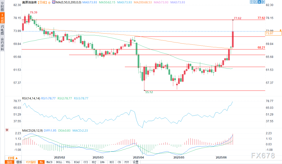WTI与布伦特油价反弹但面临技术阻力   西得克萨斯中质原油(WTI)期货价格一度冲高至77.62美元,随后回落至远低于盘中高点,但仍较当日开盘上涨8.8%。布伦特原油日内触及78.50美元,为1月以来的最高水平,现交投于74.78美元附近。   这是两个合约逾两年来最大的单日涨幅。WTI目前在78.09美元和80.47美元附近面临强劲阻力,支撑位则在71.17美元,更深层次支撑在68.21美元及200日均线附近的66.45美元。   以色列瞄准伊朗战略要地市场紧盯霍尔木兹海峡   油价飙升的导火索是以色列对伊朗核设施及军事基础设施(包括纳坦兹核设施)的袭击。尽管伊朗证实该地点遭到破坏,但未报告放射性污染。市场的直接担忧在于:此次冲突是否会影响霍尔木兹海峡?全球近20%的石油流量(约1800万至1900万桶/日)经此航道运输。   尽管目前尚未有石油运输中断的报告,但地缘政治溢价已迅速反映在价格中。瑞典北欧斯安银行(SEB)的奥莱·赫瓦尔比(Ole Hvalbye)指出,尽管市场波动,但实际石油运输仍未受影响。摩根大通分析师警告称,若霍尔木兹海峡出现最坏情况关闭,油价可能飙升至120-130美元/桶,远高于其基准预期。   欧佩克+闲置产能或缓冲供应冲击   巴克莱银行指出,近期10美元的油价涨幅尚未反映伊朗实际产量的下降。雷斯塔能源(Rystad Energy)的贾尼夫·沙阿(Janiv Shah)强调,由于伊朗大部分出口流向中国,这些运输线路最为脆弱。   不过,他指出欧佩克+仍保留闲置产能,可能成为抵御进一步供应中断的后盾。加拿大皇家银行资本市场(RBC Capital)的赫利马·克罗夫特(Helima Croft)强调,市场现在关注伊朗的报复行动是局限于地区层面,还是会针对更广泛的基础设施。   油价预测:短期看涨警惕事件风险