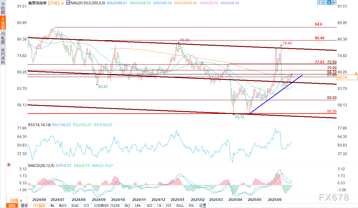 美国石油协会(API)的数据显示,截至7月4日的一周,美国原油库存增加710万桶,而此前预计为减少280万桶。通常情况下,这会对油价产生利空影响,尤其是在欧佩克+(OPEC+)也在增加产量之际。   在周六的会议上,欧佩克+集团同意将日产量增加54.8万桶,高于此前几个月41.1万桶的日增产量,超出市场预期。同样,按理说这一消息通常会对油价产生利空影响,但油价仍在两周高点附近交易。   在该消息公布后,原油市场展现出相当强的韧性。相反,市场正将焦点放在供需中的需求端。   6月中国居民消费价格指数(CPI)同比上涨0.1%,超出预期。中国是全球最大的石油进口国。   此外,美国正处于驾车高峰季,这可能有助于支撑需求。市场上也有迹象表明,投资者对特朗普贸易关税的影响不再那么担忧,因为有预期称他愿意进行谈判。美国股市继续在创纪录高点附近徘徊,美元从3.5年低点回升,对主要货币汇率创下两周新高。   如果投资者对贸易关税的担忧减轻,这将对经济增长前景有利,进而利好石油需求。   美国能源信息署(EIA)的库存数据将于今日晚些时候公布。库存若大幅增加,可能会拉低油价。   技术分析
