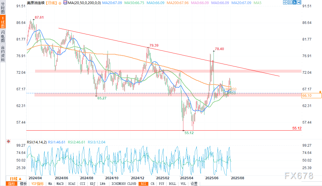 欧佩克+增产给油价带来压力 欧佩克+确认计划在9月将日产量提高54.7万桶后,原油价格大幅下跌。这一供应增长虽在广泛预期之中,但标志着该组织最大规模的减产措施——约每日250万桶,占全球需求的2.4%——被完全取消。 尽管这一整体数字相当可观,但高盛指出,由于此前超产的成员国进行减产抵消,实际供应增长可能总计约为每日170万桶。 在欧佩克+加速恢复原油供应之际,市场仍在评估日益加剧的贸易保护主义所带来的影响。美国近期对多个国家的商品加征关税,给包括原油在内的大宗商品市场又增添了一层不确定性。 对俄制裁令全球供应前景蒙上阴影 地缘政治风险依然居高不下,尤其是围绕俄罗斯原油运输方面。美国威胁要对俄罗斯石油买家实施100%的次级关税,这已经对贸易路线产生了影响。 至少有两艘运往印度的俄罗斯货船被改道,据荷兰国际集团(ING)称,如果印度炼油厂退出,可能会有每日170万桶的供应量面临风险。 不过,印度似乎仍致力于维持与莫斯科的能源联系。两名印度官员证实,尽管面临政治压力,该国仍将继续进口俄罗斯原油。这一立场可能会限制近期的供应中断,但更多制裁的威胁仍是一个不稳定的驱动因素。 经济数据和美联储政策 现在焦点是经济数据和美联储,因为这将影响未来几个月的增长预期。关税贸易现在已经结束,因为几乎所有东西都已经定价,每个人都知道将在10-20%的关税范围内达成协议。 由于美联储的前瞻指引仍倾向于宽松政策,经济增长和通胀前景目前应仍偏向上行。这应该会让市场得到支撑,但总体而言,WTI原油应该会在60美元和80美元的价格区域内保持区间波动。 技术分析